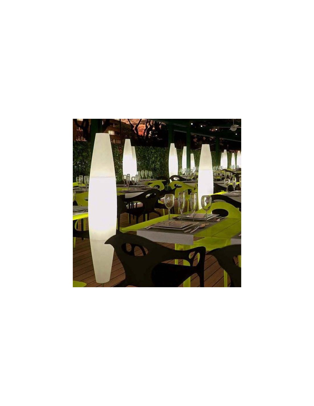 Son diffuseur extra long (130 cm de haut) réalisé en polyéthylène blanc ou jaune selon le coloris désiré diffuse une lumière douce et intense.