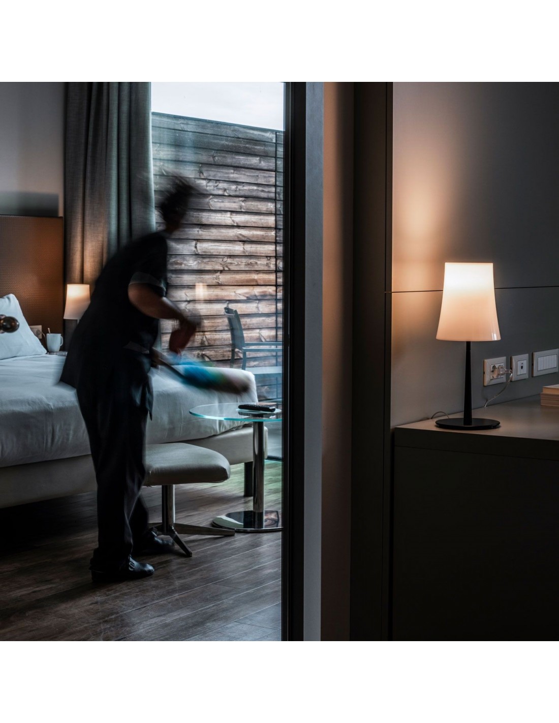 Birdie Easy a un abat-jour opalin en polycarbonate moulé à injection à la forme légèrement évasée avec un pied redimensionné.