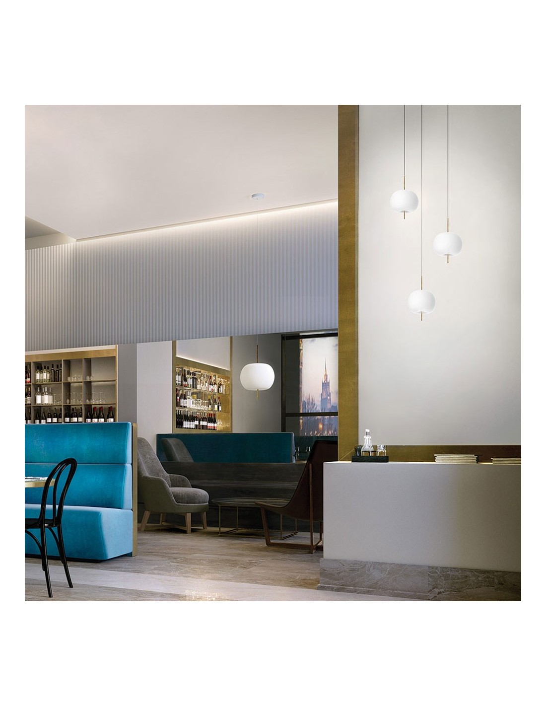 La suspension Kushi nous montre son incroyable opposition entre la douceur du diffuseur en verre opalin soufflé et la dureté de la tige en métal vernis.