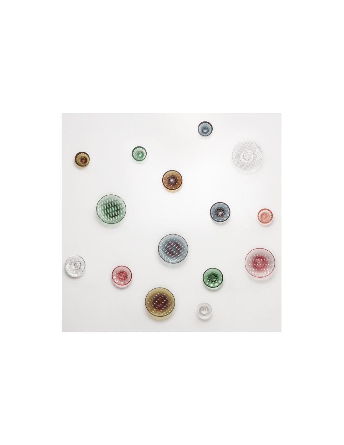 Disponibles en cristal, bleu clair, ambre, vert et rose et en 3 dimensions ces patères rondes peuvent être disposées en composition en mélangeant tailles et couleurs pour un rendu à la fois chic et unique.