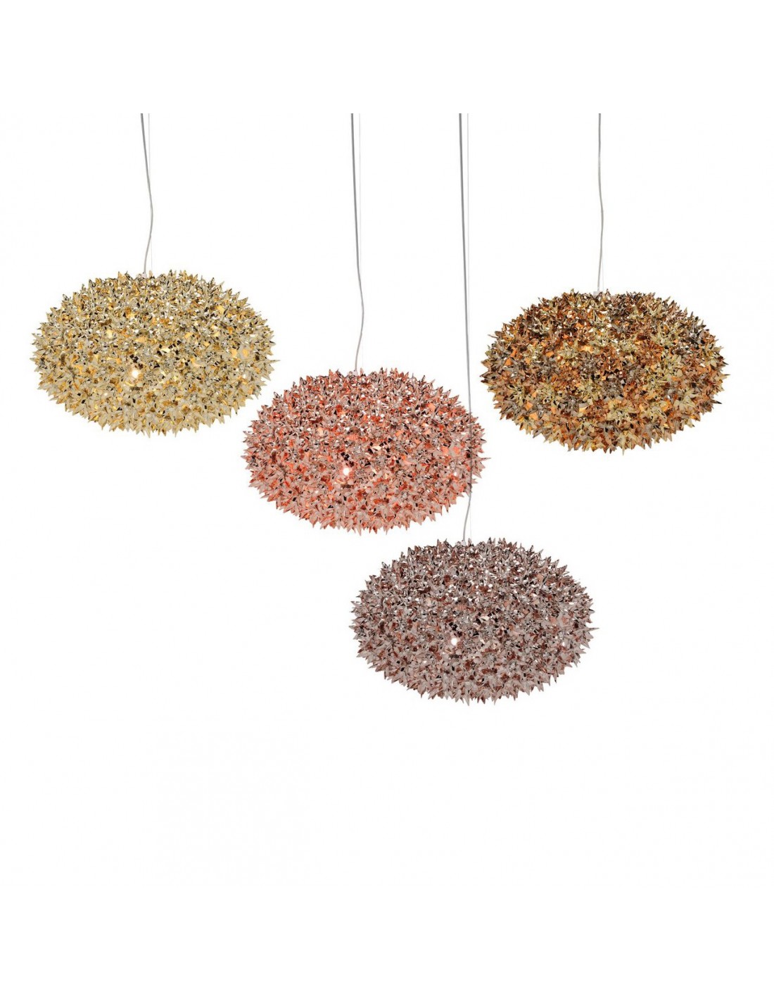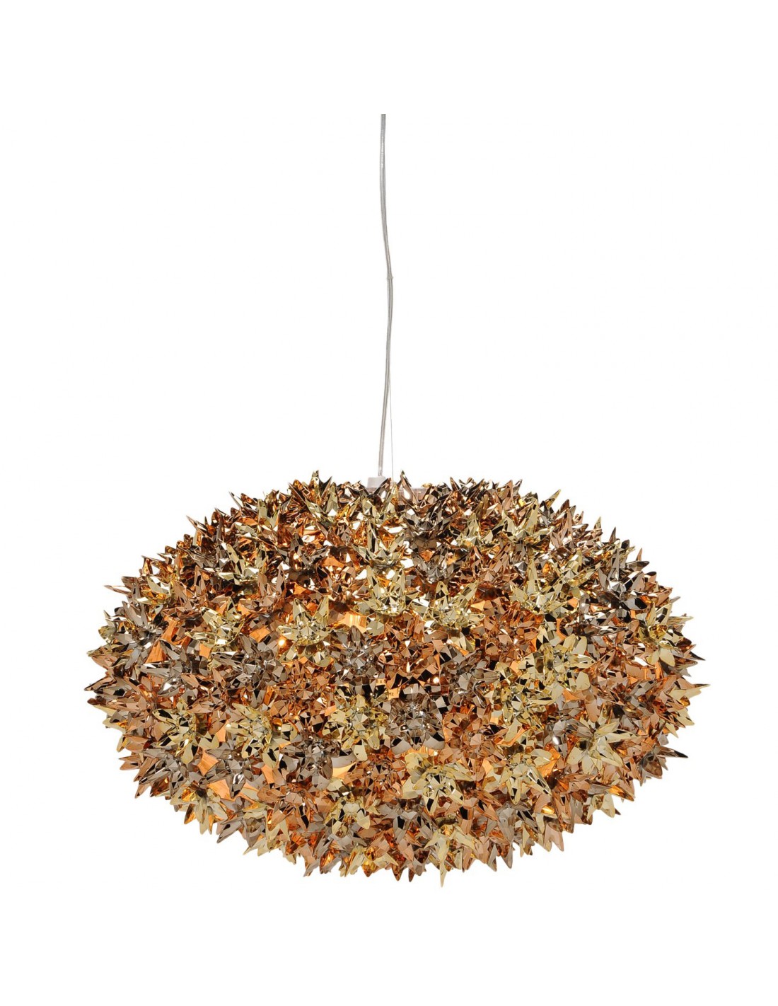 La suspension Bloom métallisée imaginée par Ferruccio Laviani pour Kartell s'enrichit d'une nouvelle forme elliptique toujours surprenante d'originalité et de raffinement.