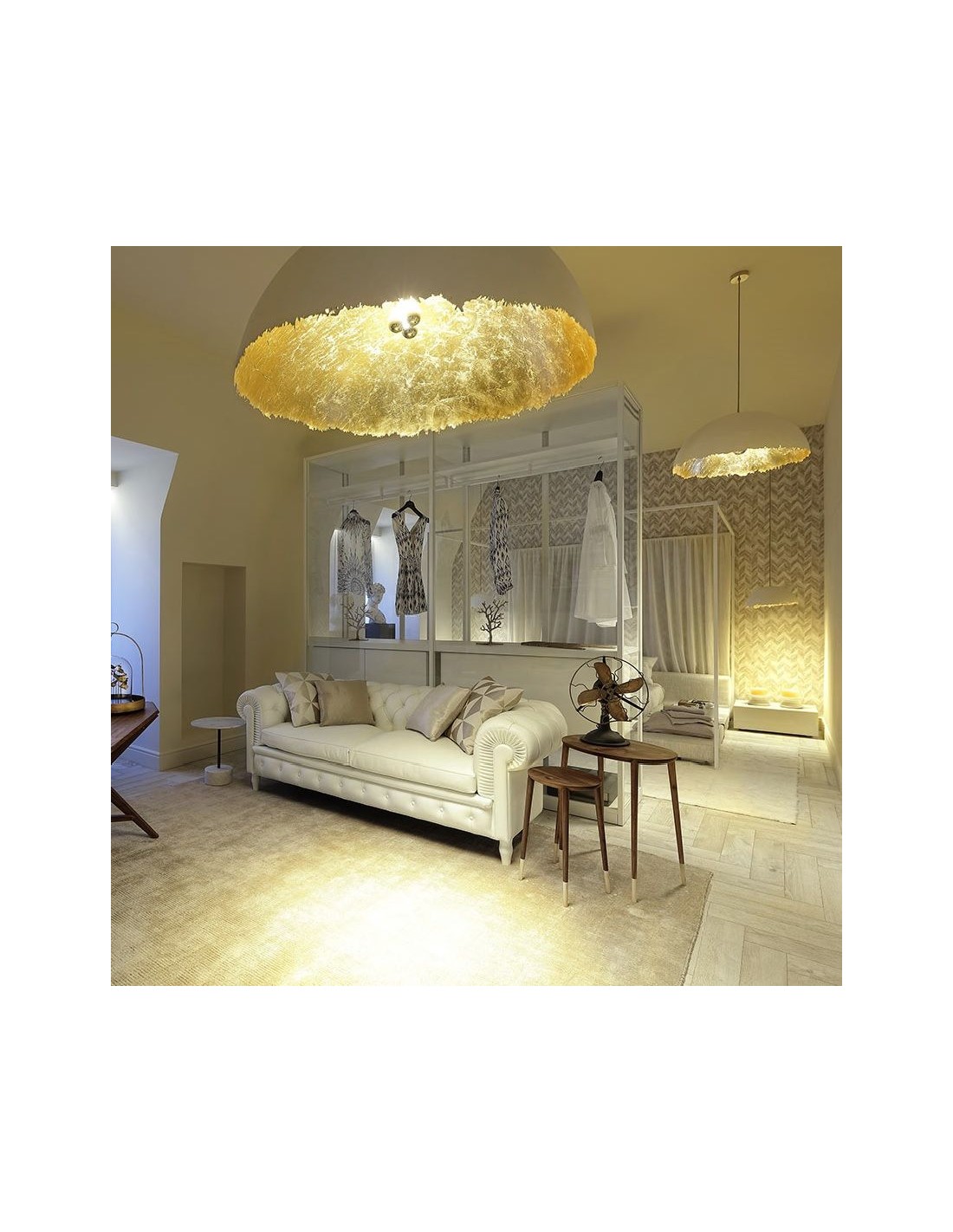 Composée d’une demi sphère réalisée en fibre de verre, l'extérieur de cette suspension est de couleur blanche pain à la main et son intérieur entièrement recouvert de feuilles d’or pour un effet des plus précieux. Ce subtil mélange de matières et de surfaces à la fois lisses et irrégulières permet à la lumière d’interagir avec la couleur et les reflets pour créer un contraste magnifique.