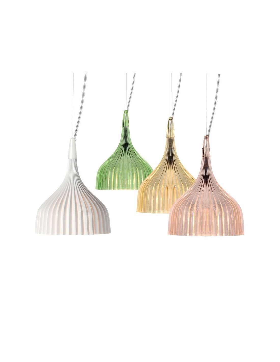La suspension E dessinée par Ferruccio Laviani pour Kartell se caractérise par son design simple et épuré.