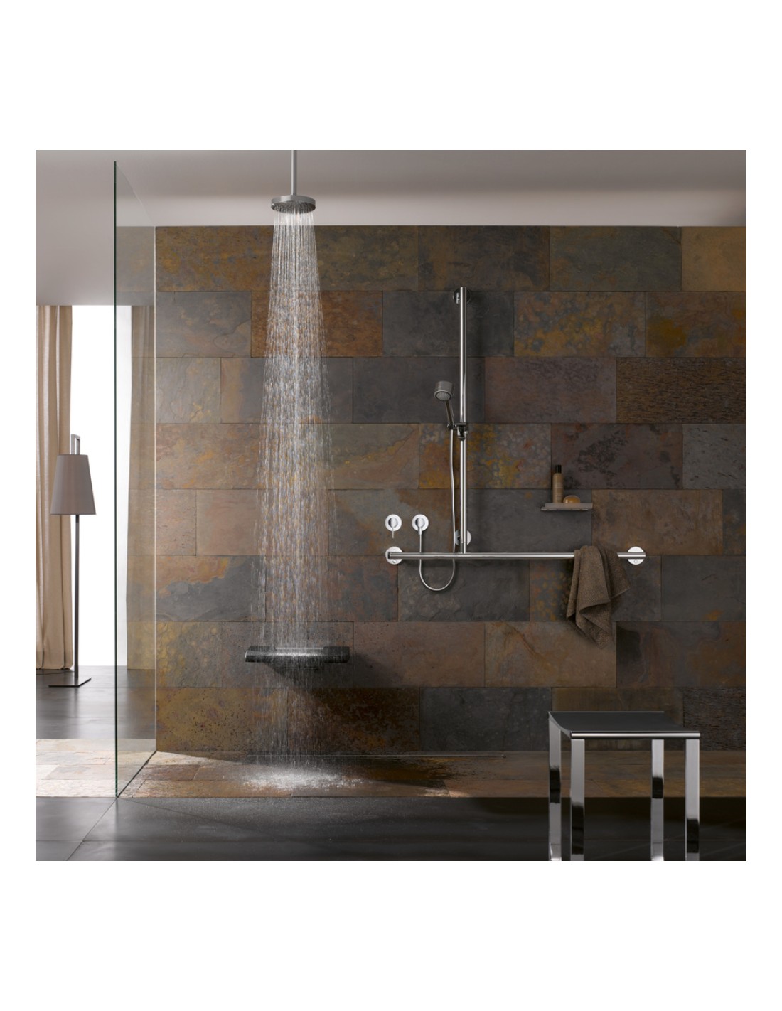 Le tabouret, spécialement étudié pour résister aux ambiances humides, est également un élément attrayant dans l’aménagement de la douche.